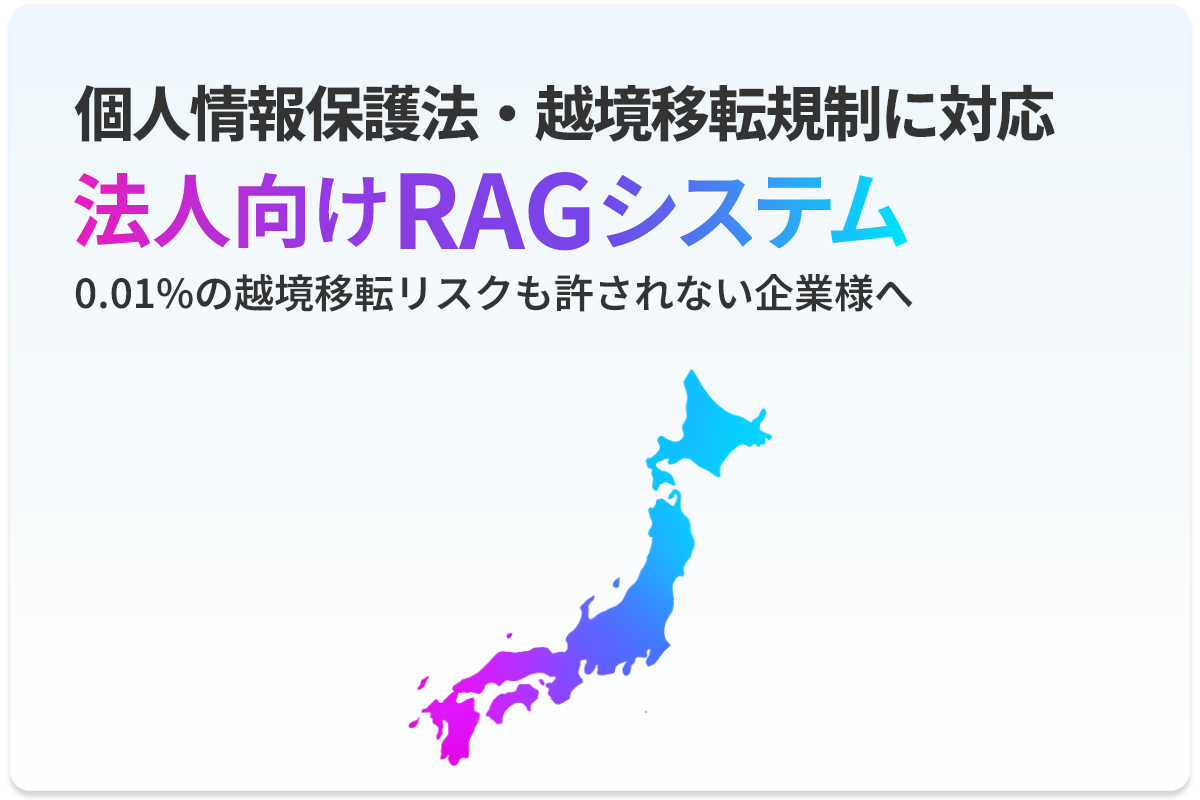 越境移転規制やSaaSの国外送信リスクで社内AI導入が難しい市場課題を踏まえ、AWS東京リージョンで推論・保存を完結するDifyベースのRAGを開発・提供しています。